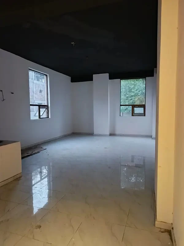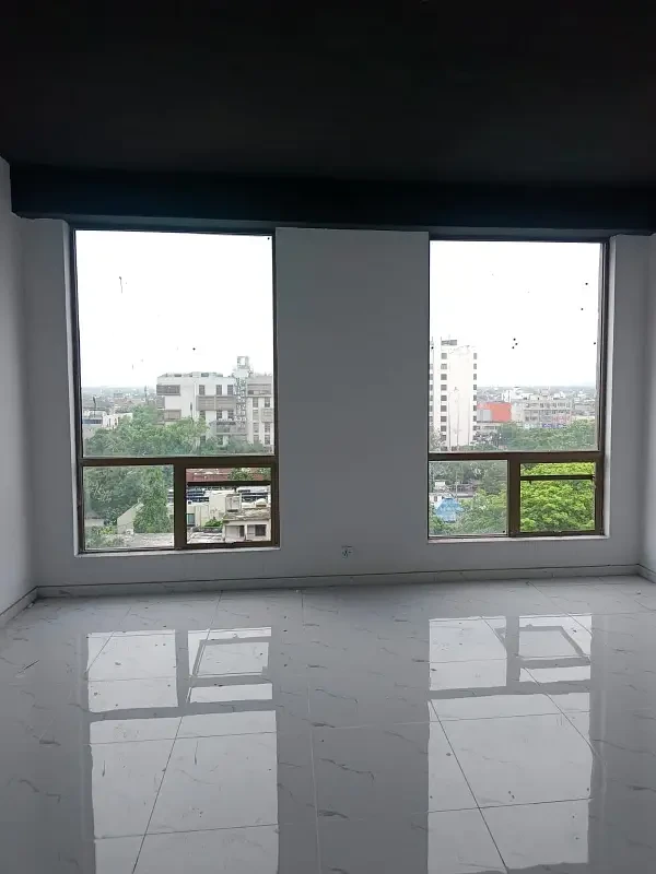 600 sq. ft. brand new corporate office for rent at MM Alam, Gulberg, Lahore. Features include an attached washroom, kitchen with cabinets, tile flooring, and full security with cameras. Located in a proper office building, ready for immediate use.