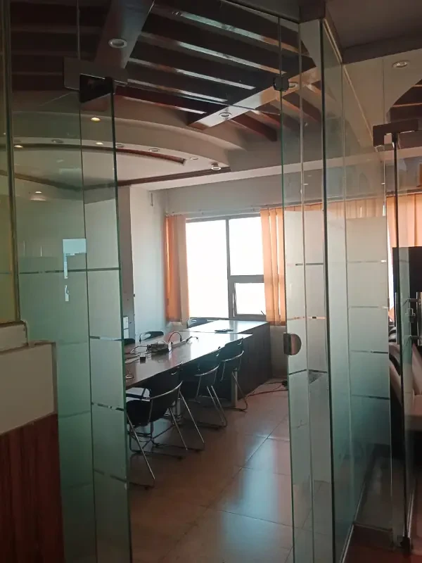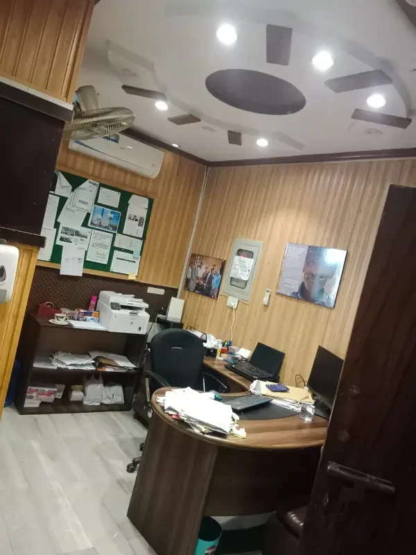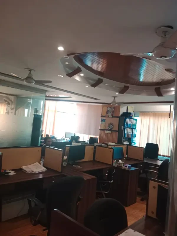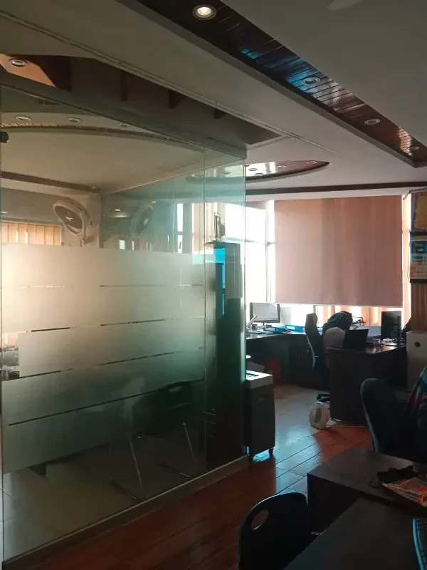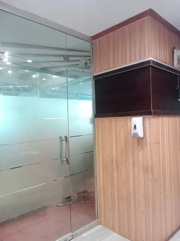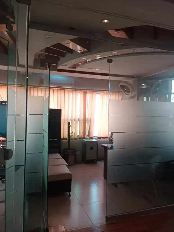 1500 sq. ft. furnished office for rent in Garden Town, Lahore. Features 5 rooms, 3 bathrooms, reception, conference room, workstations, executive furniture, wooden floors with glass partitions, AC, CCTV, store, and kitchen.