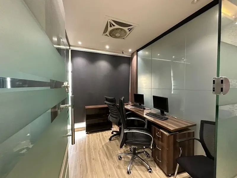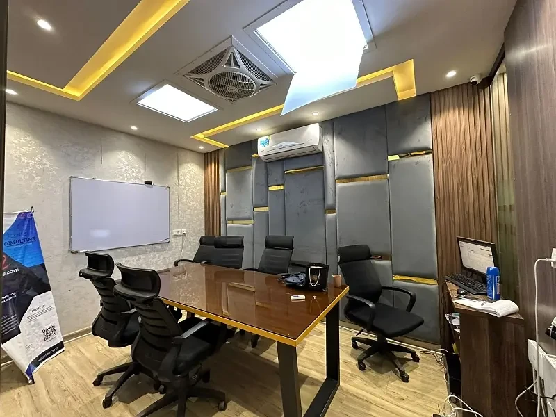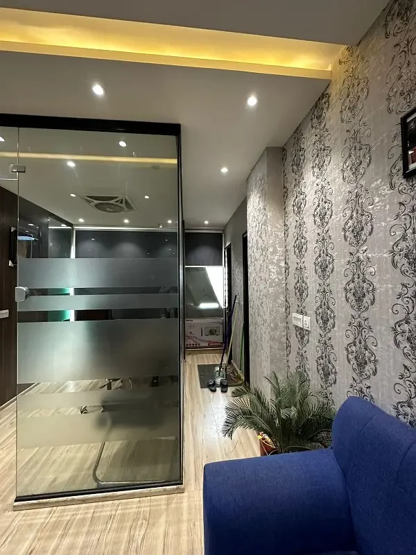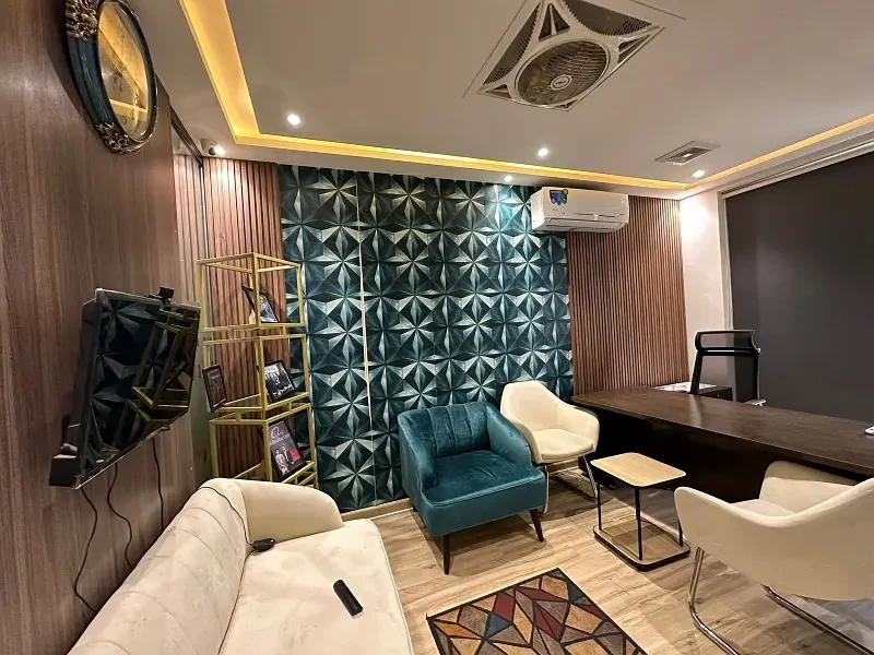Additional amenities include a separate bathroom and kitchen, stylish ceiling design, and beautifully decorated walls, creating a professional and visually appealing environment.