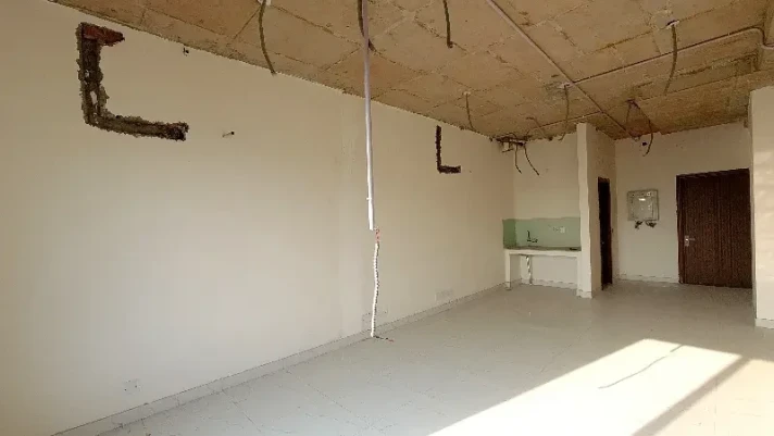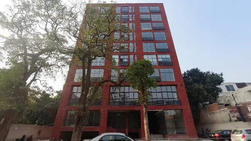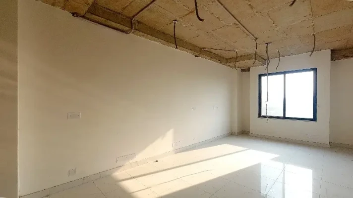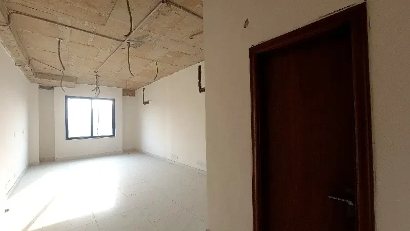 Second-floor office for rent on Main Boulevard Gulberg, Lahore, in a well-maintained commercial building. Features include pre-installed AC piping, reception area, and biometric access system.