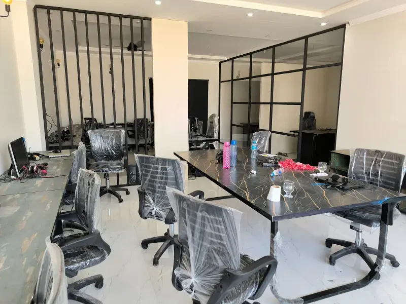 The office includes a **staff hall**, **waiting/dining area**, **dry kitchen**, **attached bath**, and **two executive cabins** with sofa seating. It comes **fully furnished** with **tables, chairs, partitions, workstations, lights, fans, dispenser, oven, and UPS**—providing everything needed for a smooth business operation.
