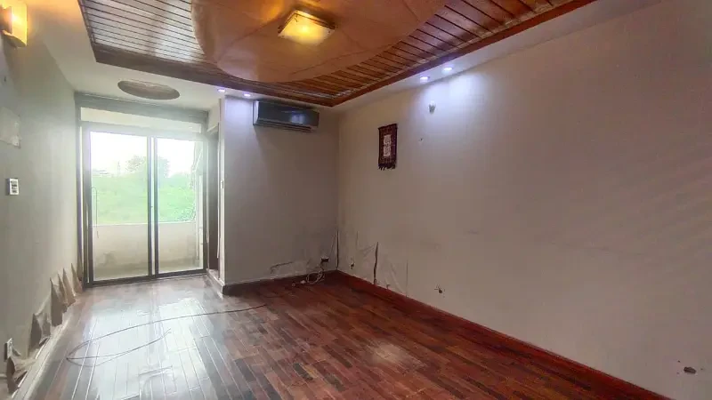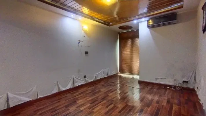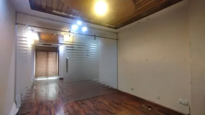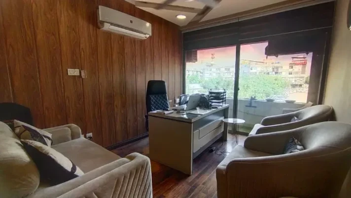 The office features a stylish ceiling design, glass partitions, wooden flooring, window blinds, and high-quality wallpaper, creating a contemporary and professional workspace. The building is well-maintained, easily accessible, and equipped with a lift for added convenience.