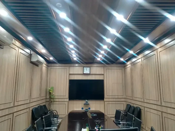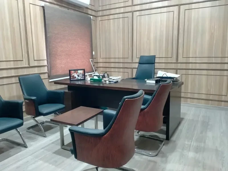 The layout includes a reception area, waiting lounge, managerial cabins, executive offices with attached baths, a conference room, meeting room, and spacious halls, providing a complete office environment. It also features a kitchen along with separate washrooms for ladies and gents, ensuring convenience for staff.