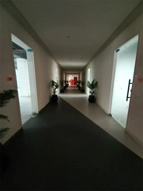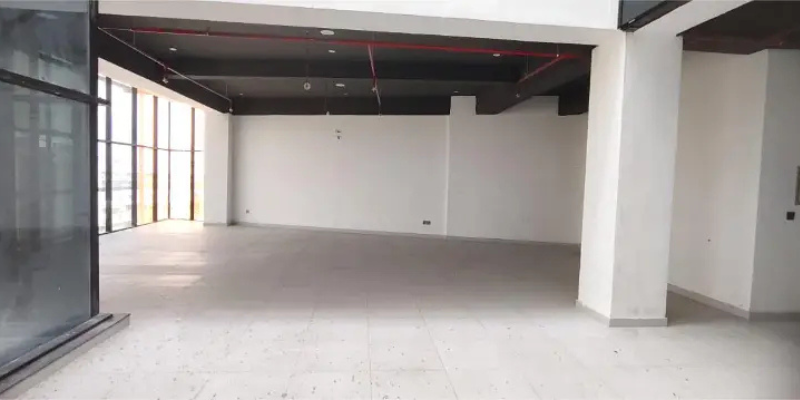 The office features a spacious hall, tiled flooring, ceiling work, an open kitchen, and a bathroom. The building is equipped with a lift, firefighting system, 24/7 CCTV surveillance, and a dedicated security guard.