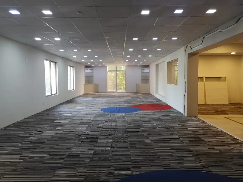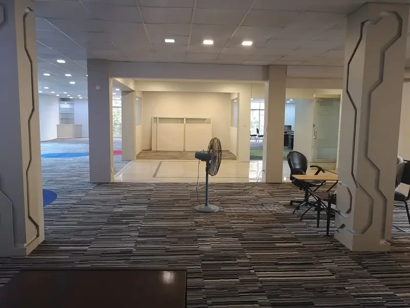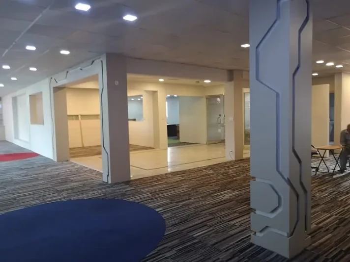 A fully equipped commercial office space is available for rent, offering a modern layout and premium facilities. The office is designed with tiled flooring, a stylish false ceiling, and complete wiring with networking already installed, ensuring a seamless setup for any corporate use.