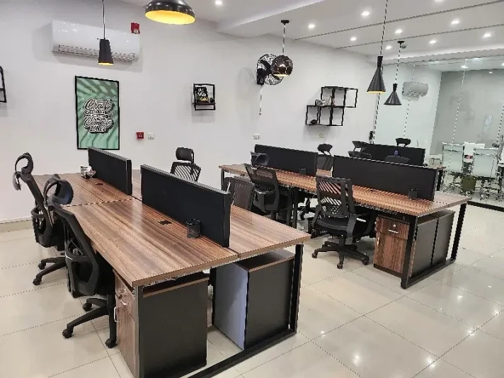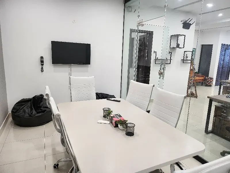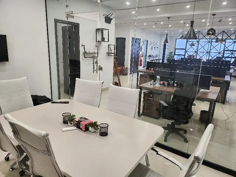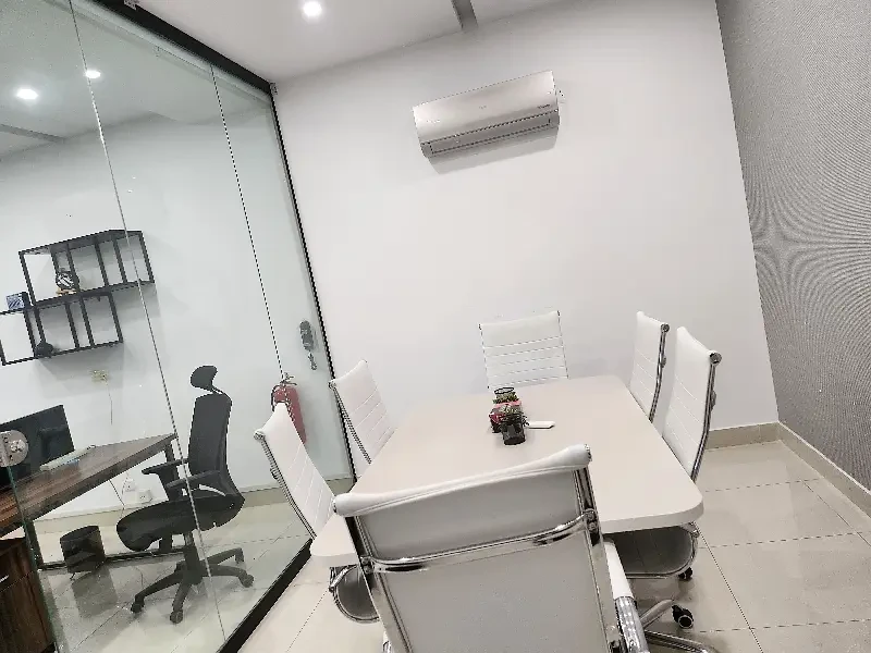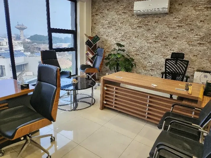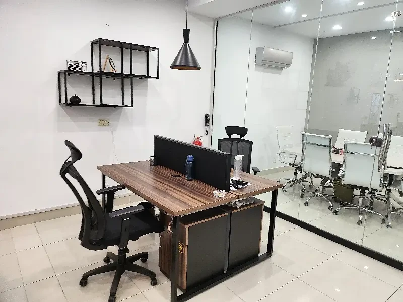 The office features one executive room, one conference room, and an open layout suitable for team operations. It comes equipped with brand-new furniture, new tiled flooring, a stylish ceiling design, and beautifully decorated walls that create a professional and modern environment. Additionally, the space includes two bathrooms and a kitchen, ensuring convenience for daily operations.