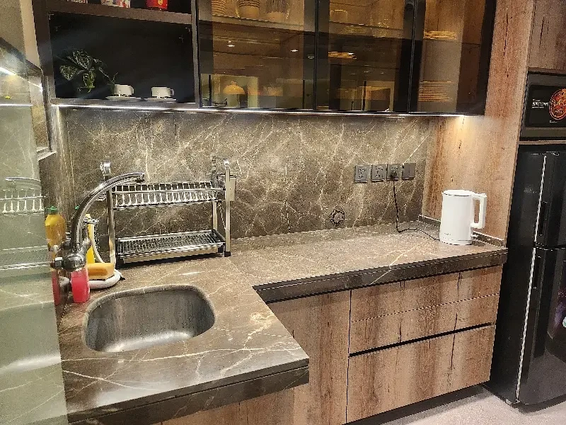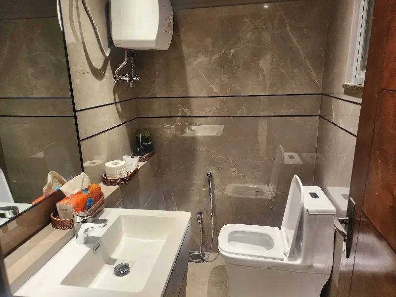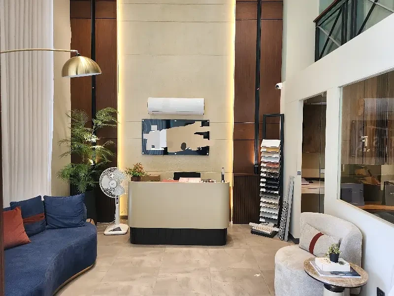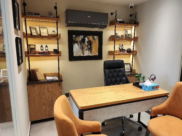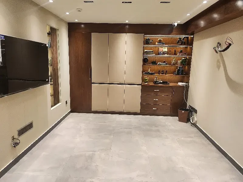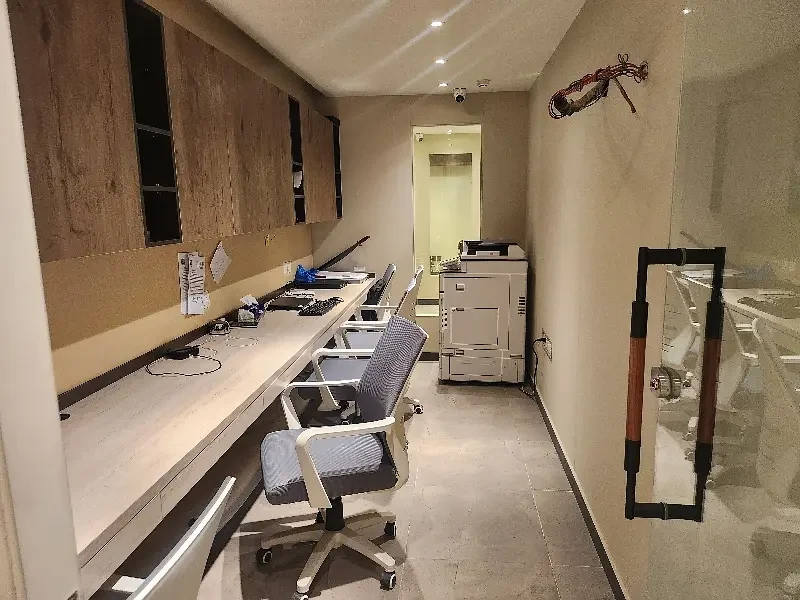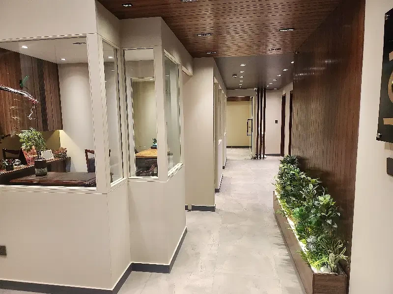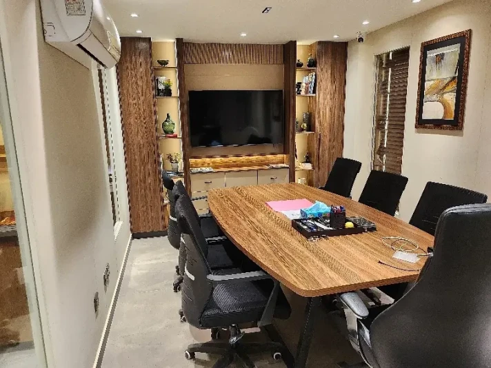 The office comprises a spacious main hall, one executive room, and one meeting room, providing flexibility for open workstations, private cabins, and client meetings. The space is elegantly finished with wooden flooring, a Spanish-style ceiling, and tastefully decorated walls that add a refined, modern aesthetic. It also includes two bathrooms and a fully functional kitchen, ensuring convenience for staff throughout the day.