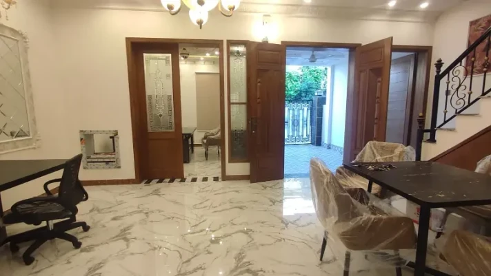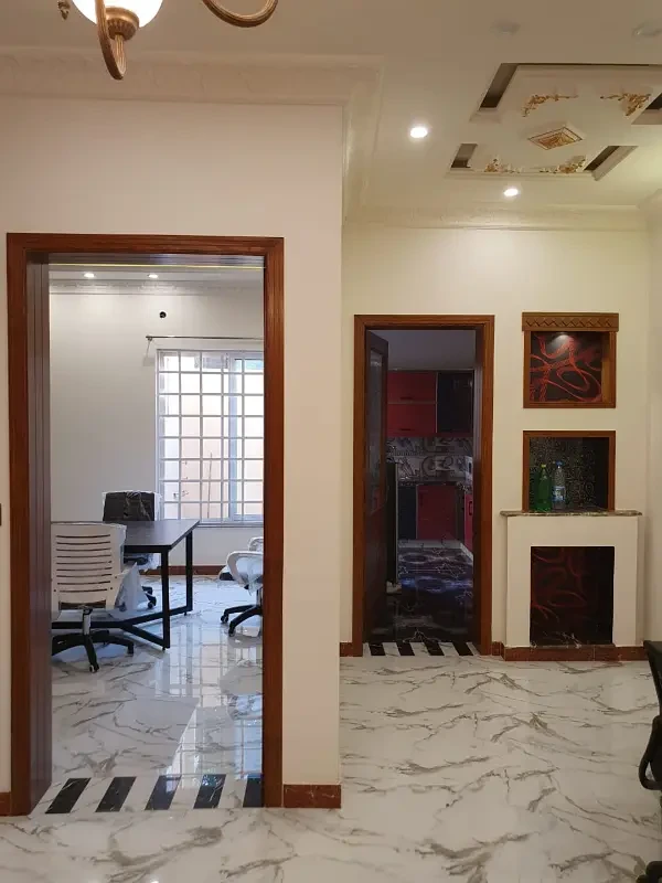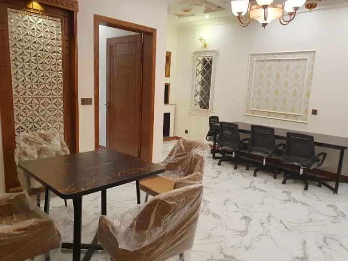 A brand new furnished office is available for rent, featuring two floors with a modern and functional layout. Each floor includes three rooms, a lounge, and a kitchen, offering ample space for team operations. The property also provides two halls, a waiting and dining area, a dry kitchen, attached baths, and an executive cabin with sofa seating.