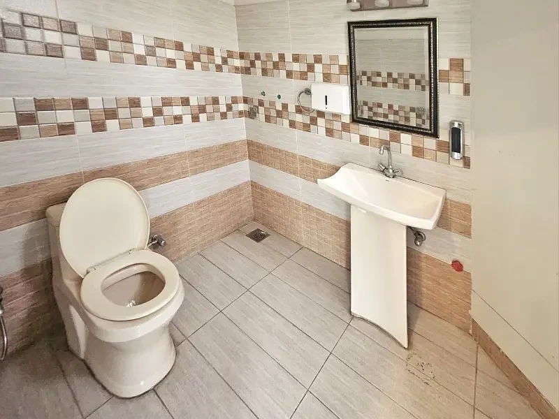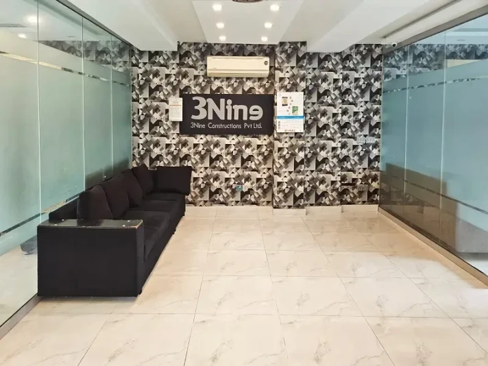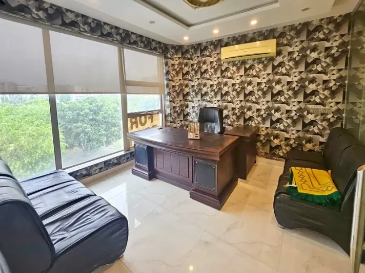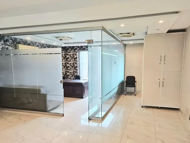 The office features two glass cabins furnished with executive tables and sofa seating, built-in cabinets for staff, and a fully equipped kitchen with ample storage. It comes with three air conditioners, a CCTV surveillance system, elegant wallpaper interior décor, and remote-controlled ceiling fans. The exterior glass is fitted with heat-resistant solar paper sheets for energy efficiency, while a separate electricity meter ensures independent usage. A Fuji lift in the building provides easy and reliable access.