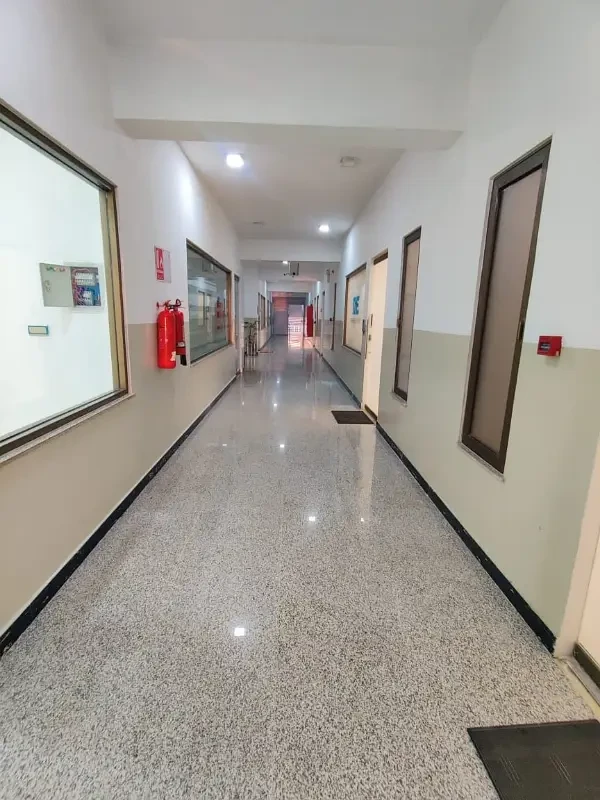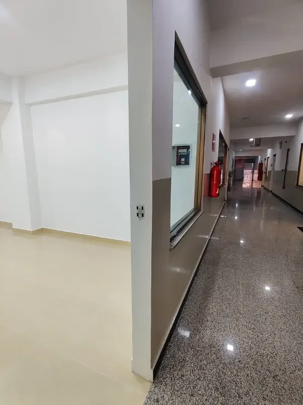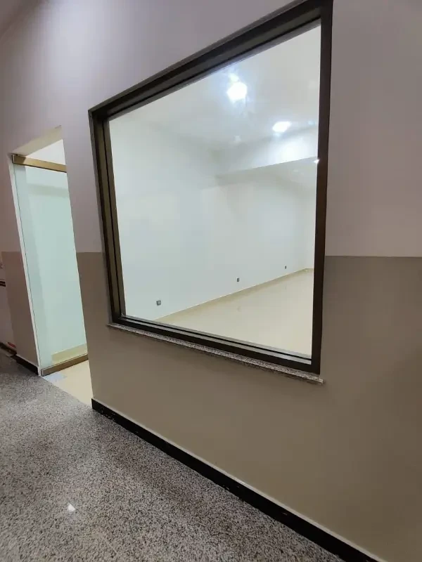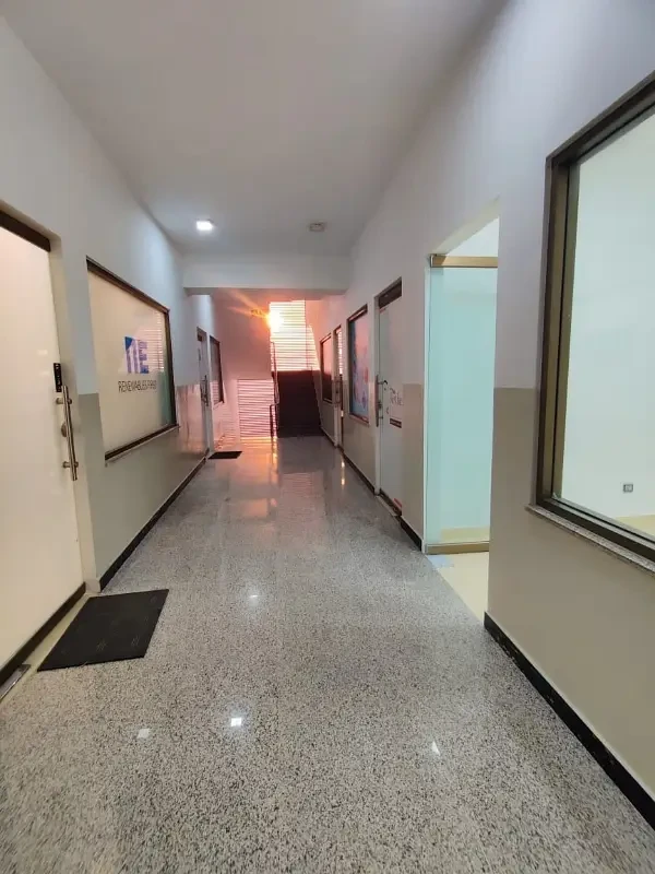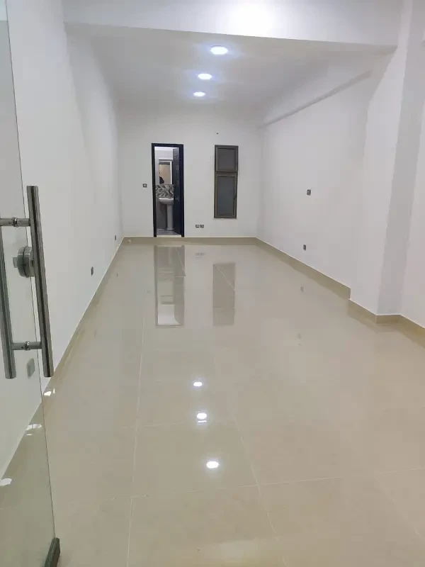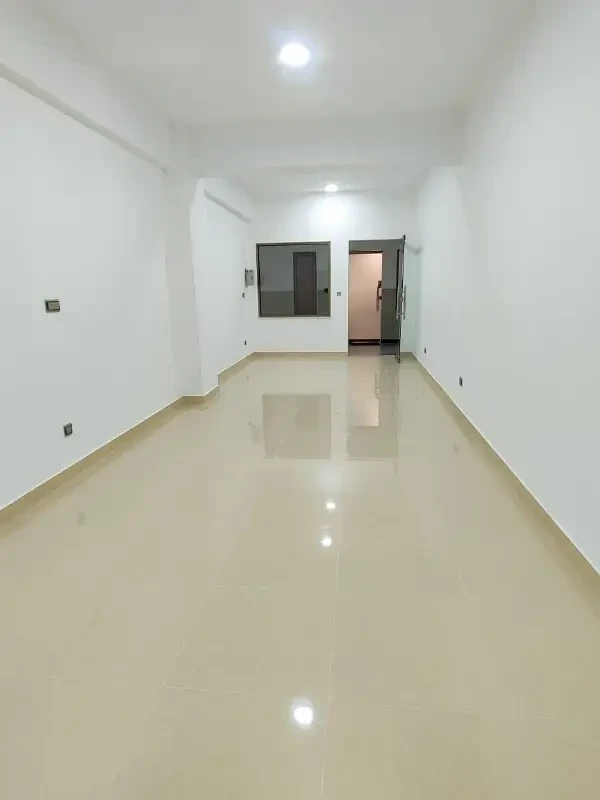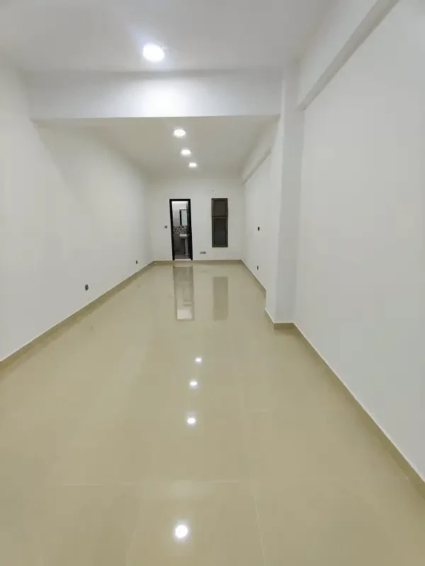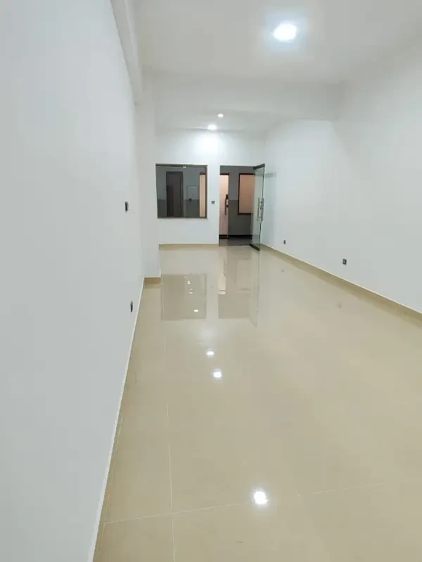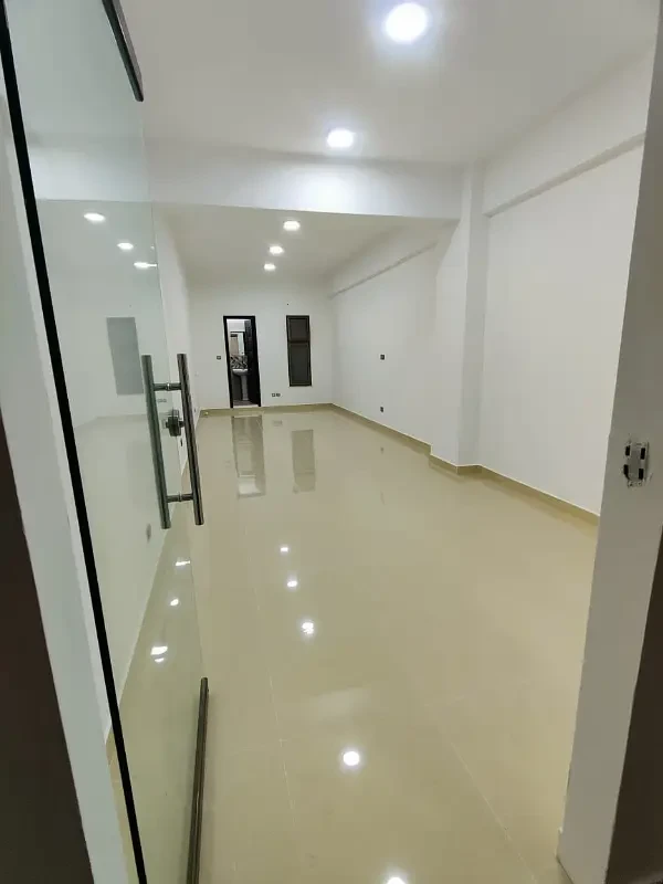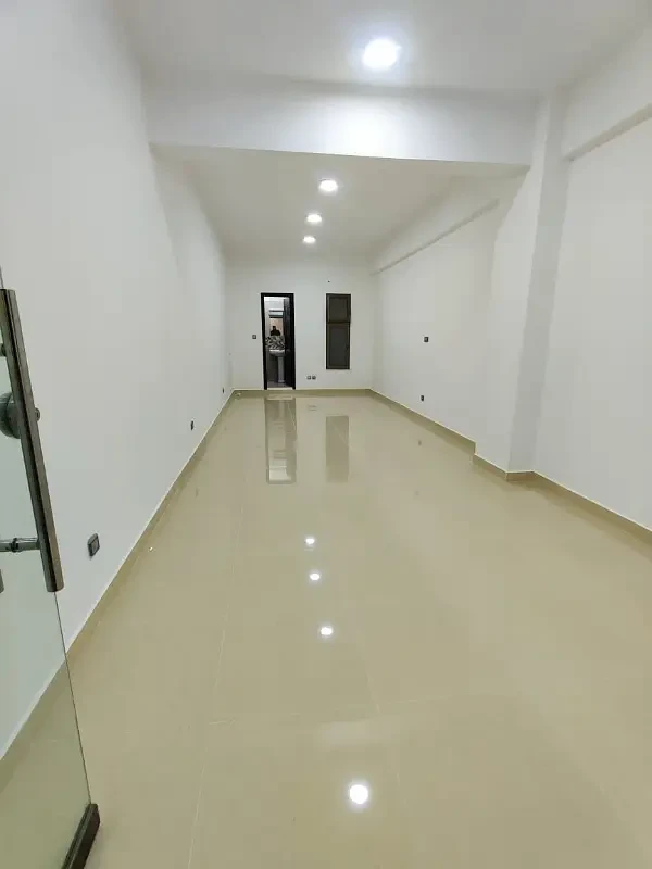 Office space for rent with a spacious open hall, kitchen, and washroom. Features include lush tiled flooring, new ceiling, and 24-hour security in a clean and professional environment.