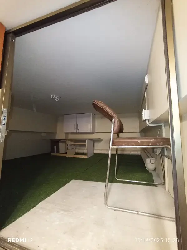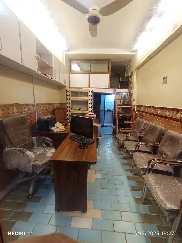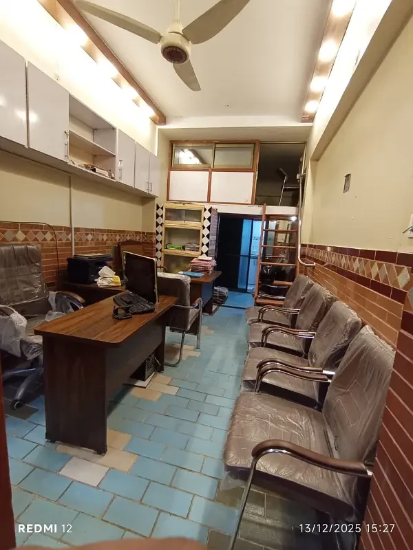 Fully furnished shop available for rent in Block 13-B, Gulshan Market, ideal for office use. The shop includes tiled flooring, air conditioning, glass door, kitchen, attached bathroom, cabinets, tables, and chairs.