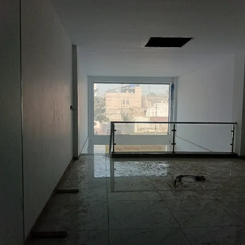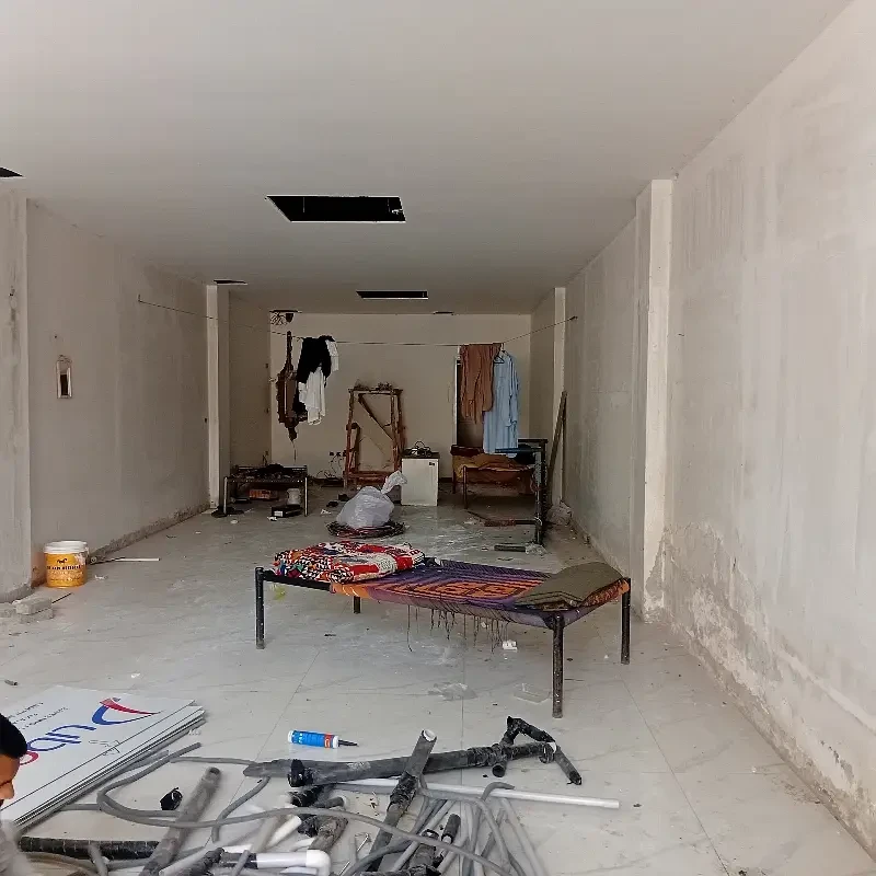 A commercial shop is available for rent on MM Alam Road near Mini Market. The property features a ground floor area of 1,300 sq. ft. and a mezzanine of 700 sq. ft., providing ample space for retail or business operations.
