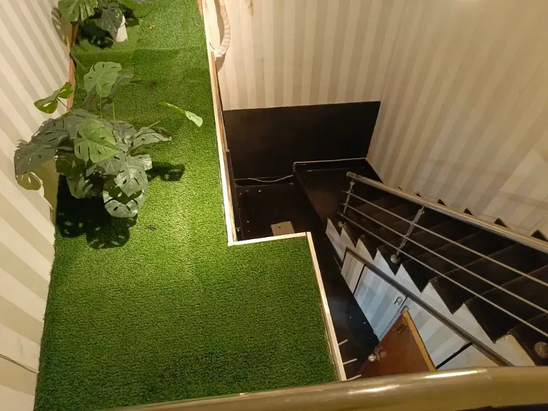 2 Marla sector shop for rent in DHA Phase 2, ideal for office use. The property includes a spacious ground-floor hall, 2 mezzanine cabins, a kitchen, and a bathroom with clean marble flooring.